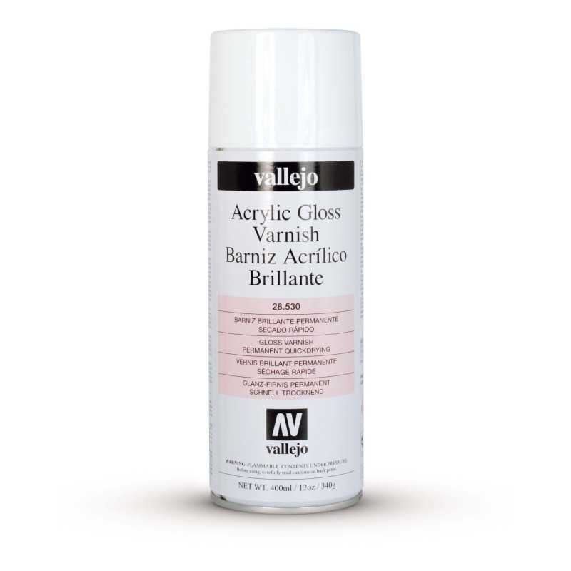 Barniz brillante acrílico en spray en bote de 400ml.