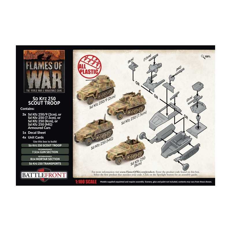 Includes three Plastic Sd Kfz 250 Scout platoon Sprues, three Crew Sprues, one Decal Sheet, and four Unit cards.