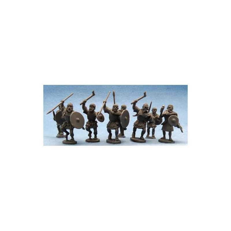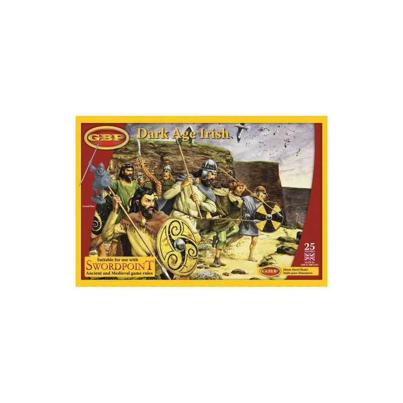 Contains 5 sprues of plastic Dark Age Irish warrior parts. Each sprue has 5 different bodies, 7 different heads, 5 large round shields, 5 bucklers, 3 different Irish cloaks, 4 spear arms, plus all the arms you need including one holding a short-sword, one with a hand-axe, a set of arms to use with the included Dane-axe plus a couple of extra axes and a short-sword in scabbard. These make up 25 figures in a wide variety of poses.